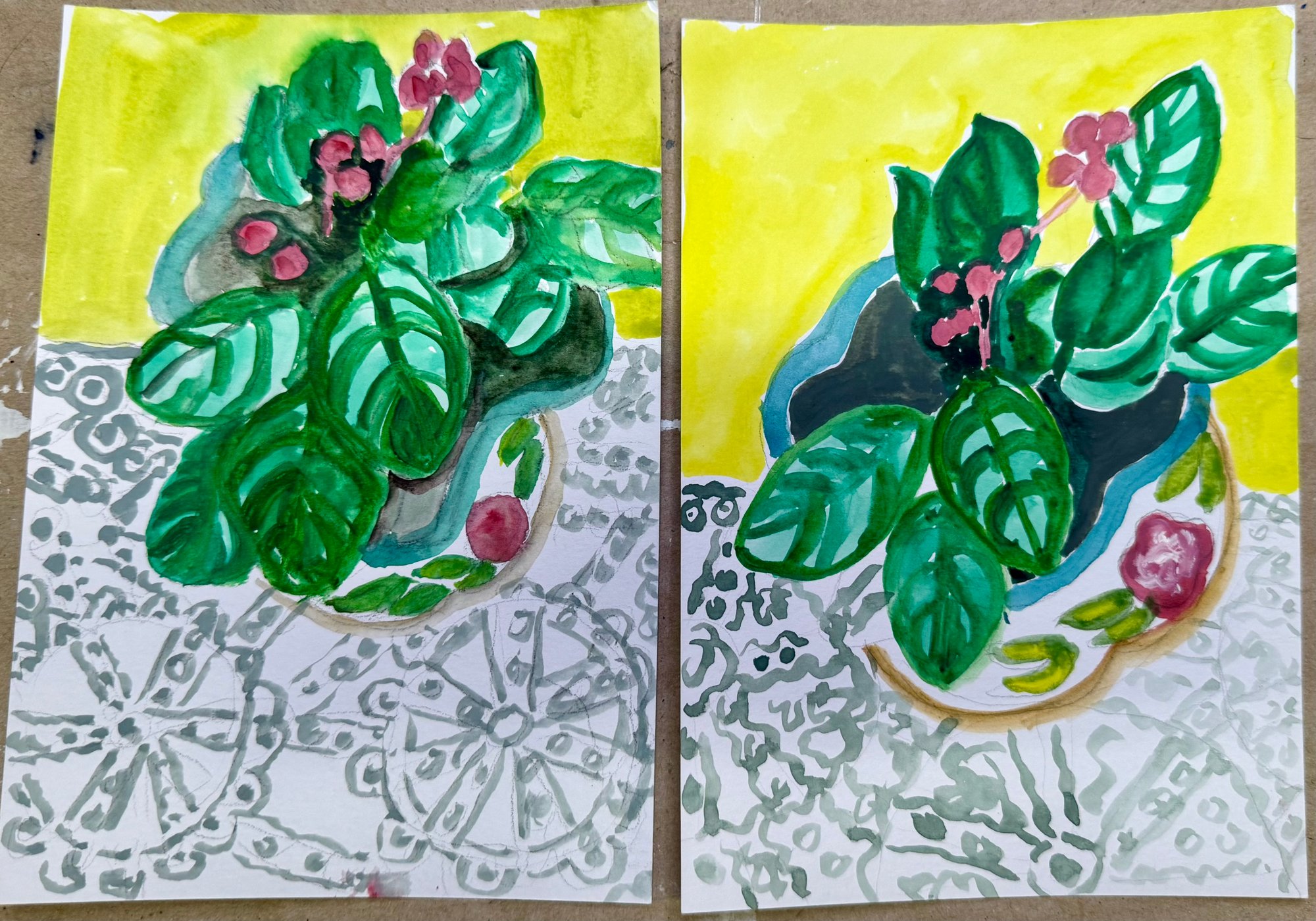 2 Small Floral Watercolors "African Violets in a Vintage Pot"